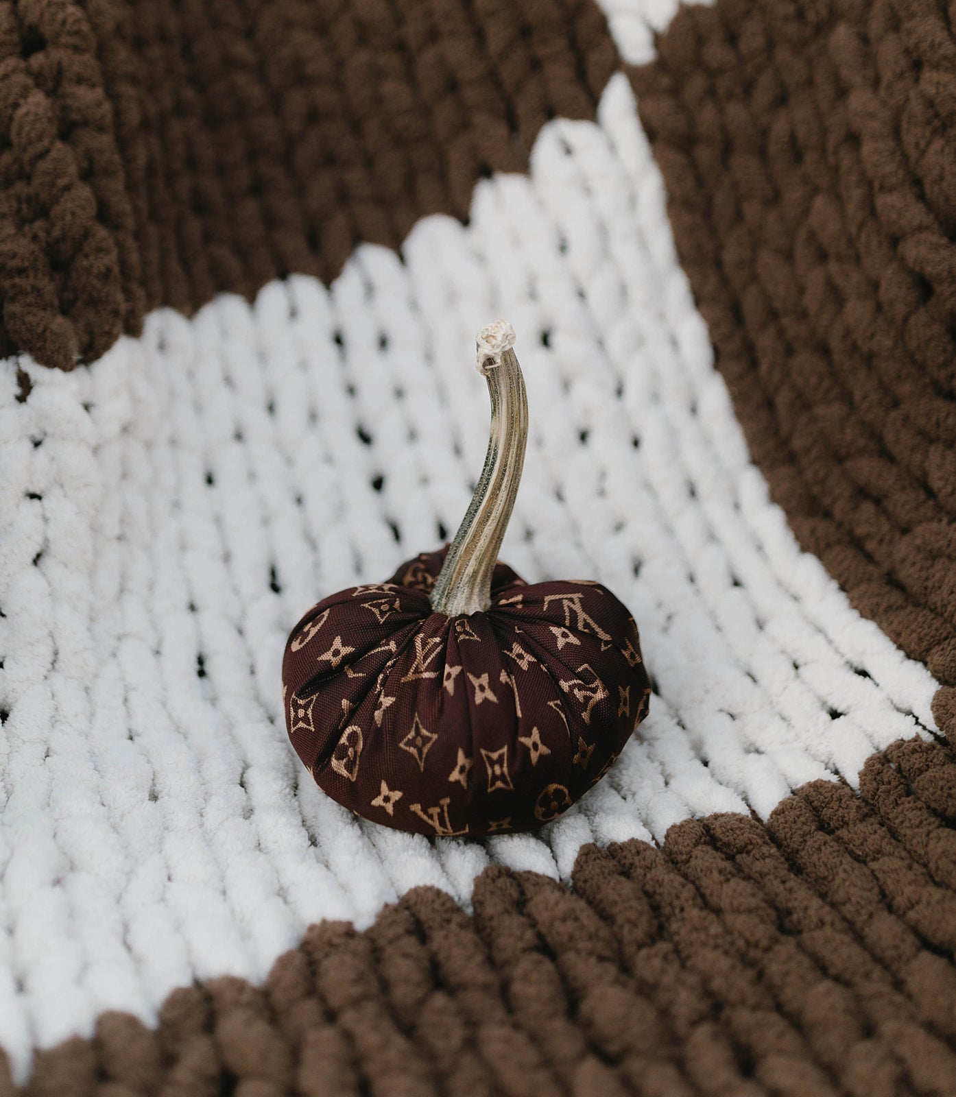 Elevate your seasonal decor with these one-of-a-kind Louis Vuitton pumpkins! This handcrafted pumpkin features a rich, deep brown fabric with a gold monogram inspired pattern. Topped with a natural wood stem for a chic yet rustic finish.